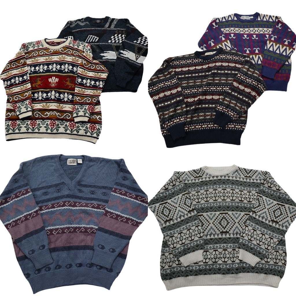 > 古着卸 まとめ売り 総柄ニット セーター 6枚セット (メンズ XL ) クルーネック フェアアイル柄 Vネック 中古 古着 NC3488