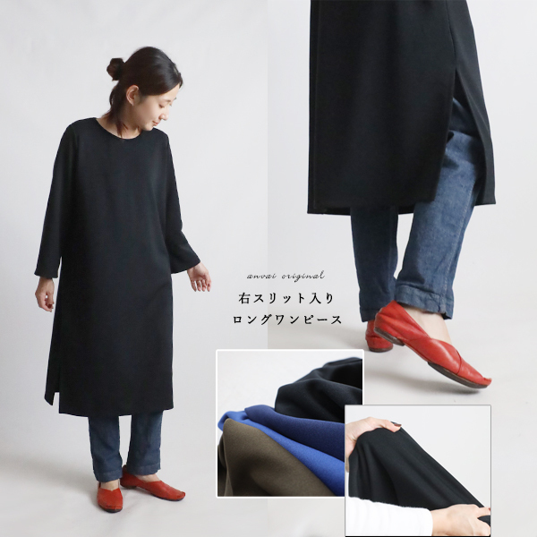 - 新作 103cm シワ知らず。ジャージ伸縮ストレッチ生地 右スリット入 ワンピース チュニック ブラック K45D