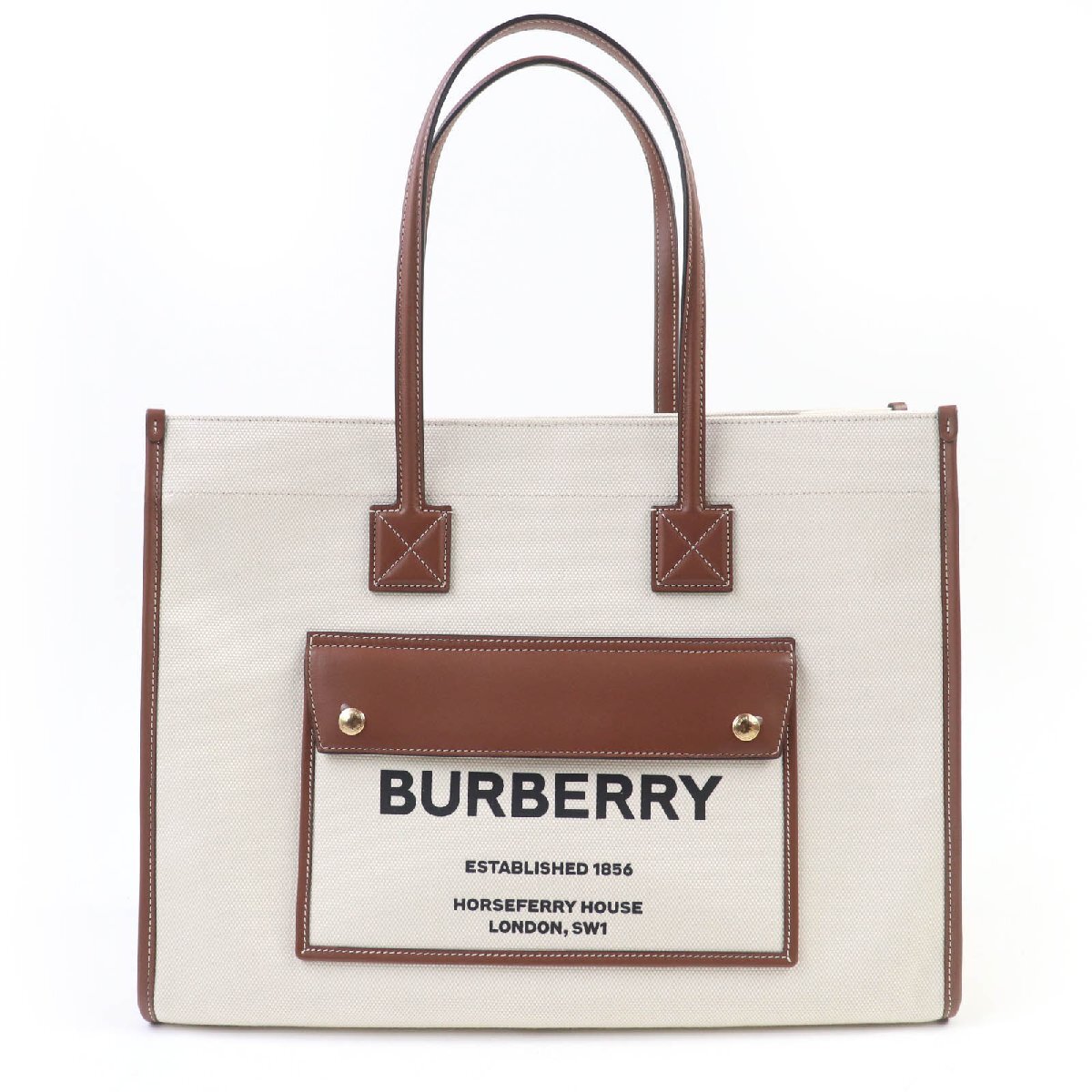 > 未使用品☆BURBERRY バーバリー 8044129 ミディアム フレヤトート キャンバス レザー使い トートバッグ ナチュラル タン イタリア製