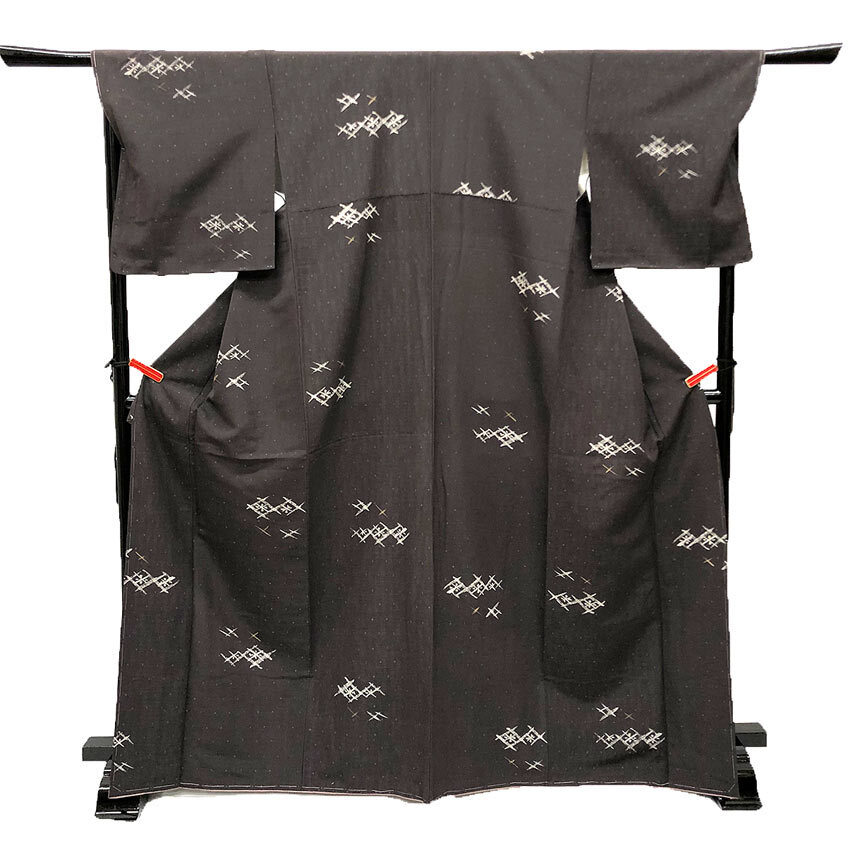 > 京やG091 正絹 紬 飛び柄絣文 裄長め ワイドサイズ 大きなサイズ ブラウン パールトーン加工済み 袷仕立て 仕立て上がり 未使用