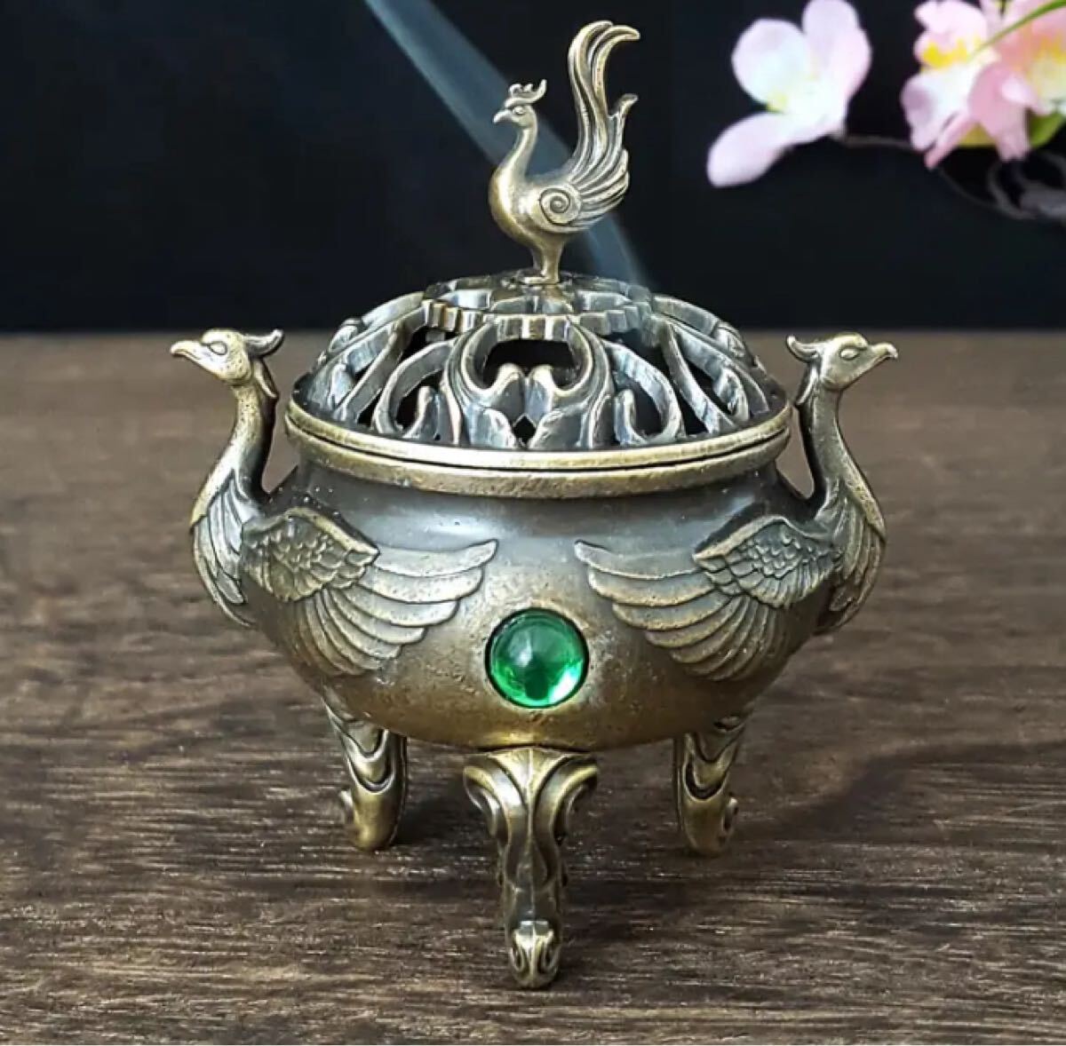 - 【孔雀】香炉 お香立て 彫刻 金属製 お香皿 エスニック アジアン 酉 置物 インテリア 縁起物 風水 開運 縁起 鳥 オブジェ