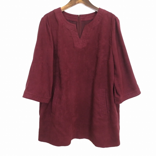 > #w レリアン Leilian チュニック 13+ エンジ 七分袖 スエード調 カットソー 前ポケット 大きいサイズ 13号 日本製 レディース [952807] k01