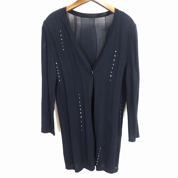 > #a レリアン Leilian カーディガン 9号 紺 ロング 長袖 綿混 ラインストーン 編み柄 日本製 レディース [962985] k01