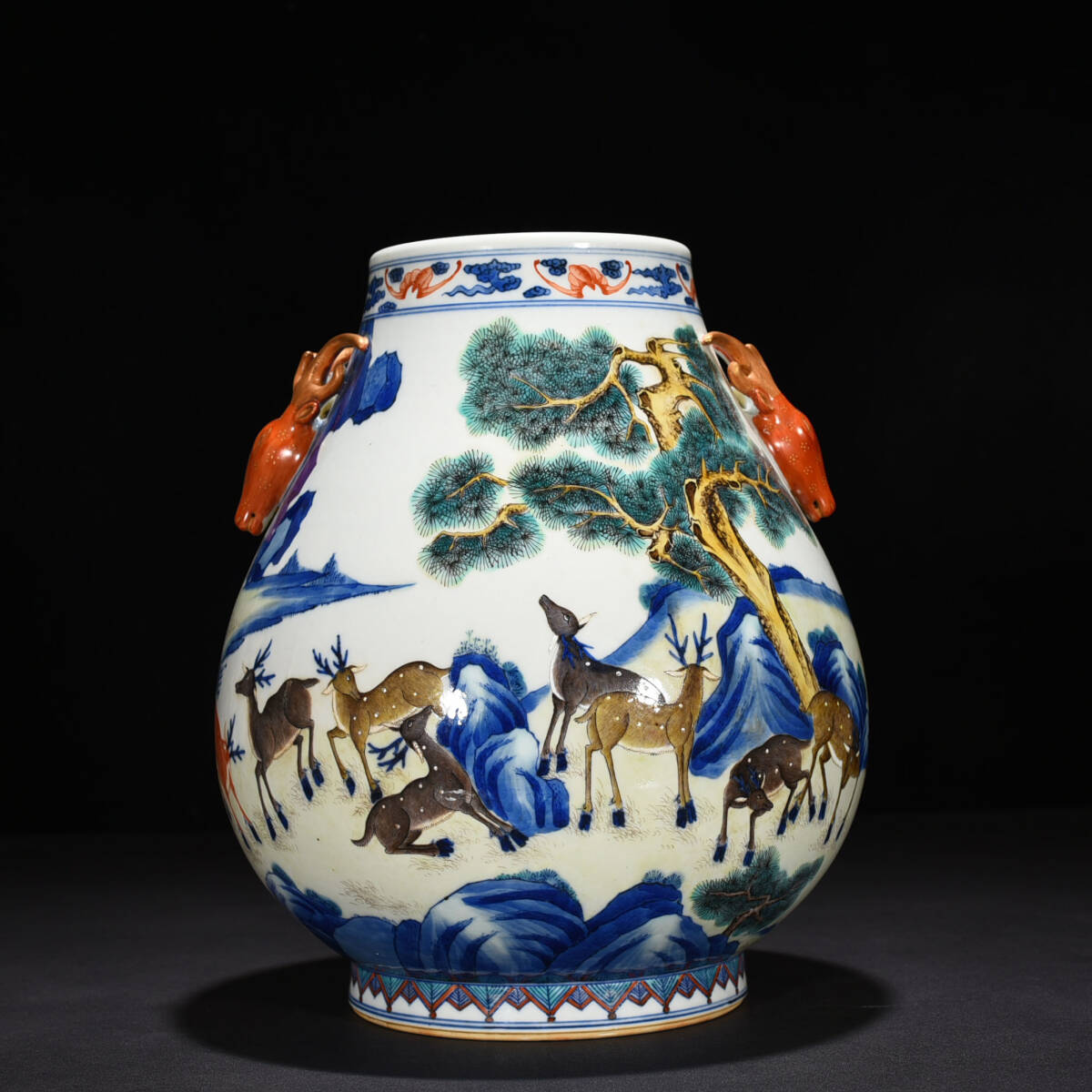> ◆珍蔵◆中国古美術 大清道光年製 青花 五彩 古陶磁 百鹿図鹿頭尊瓶 細密細工造 置物 擺件 古賞物 骨董品 時代物 A33