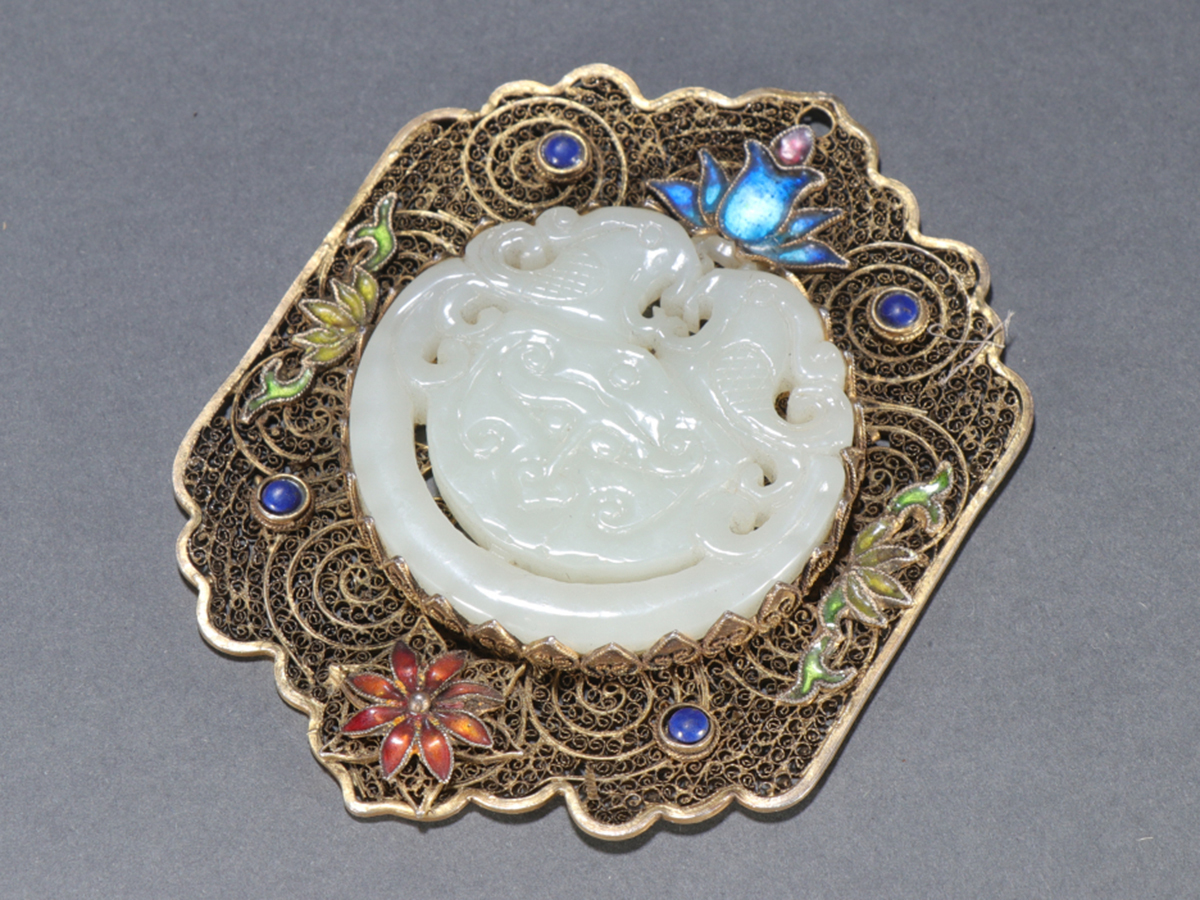 - ▽鴻▽清時代 銀金製 花絲焼藍 嵌め和田玉彫 双鳳紋掛件 時代物 中国古美術 骨董品