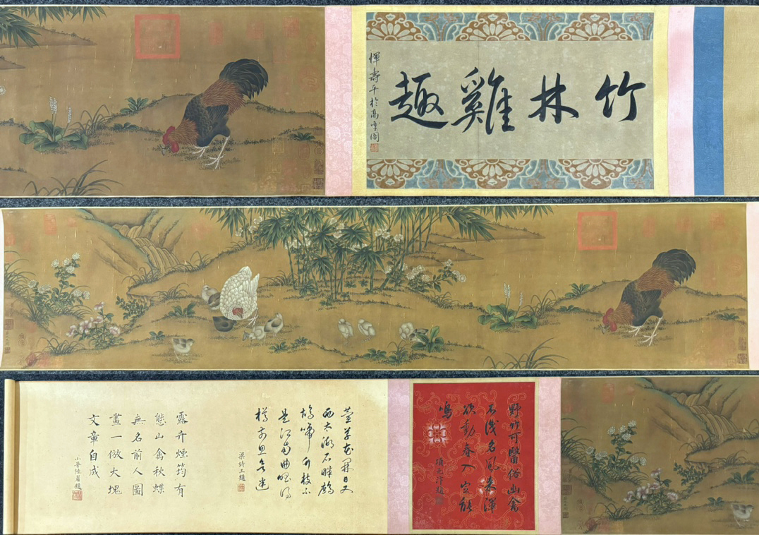 - ▽鴻▽古書道【元代書画家 王淵書 絹本 竹林鶏趣図長巻】 真筆肉筆 骨董書画 掛け軸 時代物 中国古美術 骨董品