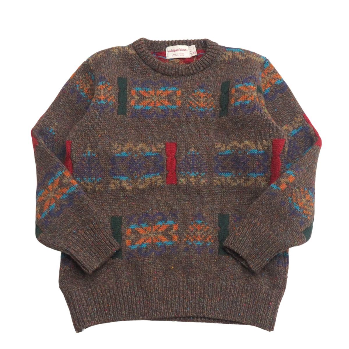 > TI7481▽英国製 マイケルロス michael ross メンズ4 クルーネック ウールニット セーター 総柄 ブラウン系