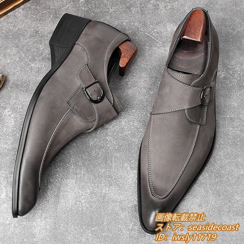 - 定価9万★最高級 モンクストラップ 牛革 ビジネスシューズ職人手作り 本革 レザーシューズ ポインテッド革靴 バックル紳士靴 グレー 28.0cm