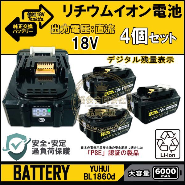 > ★送料無料・30日間保証付き★デジタル残量表示(10%-100%) 4個セット マキタ18V 6.0Ah バッテリー PSE取得済み