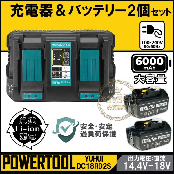 - ★送料無料・30日間保証付き★マキタ18v 充電器DC18RD+BL1860B 6.0Ah バッテリー 2個セット 互換 マキタ バッテリー 残量表示機能