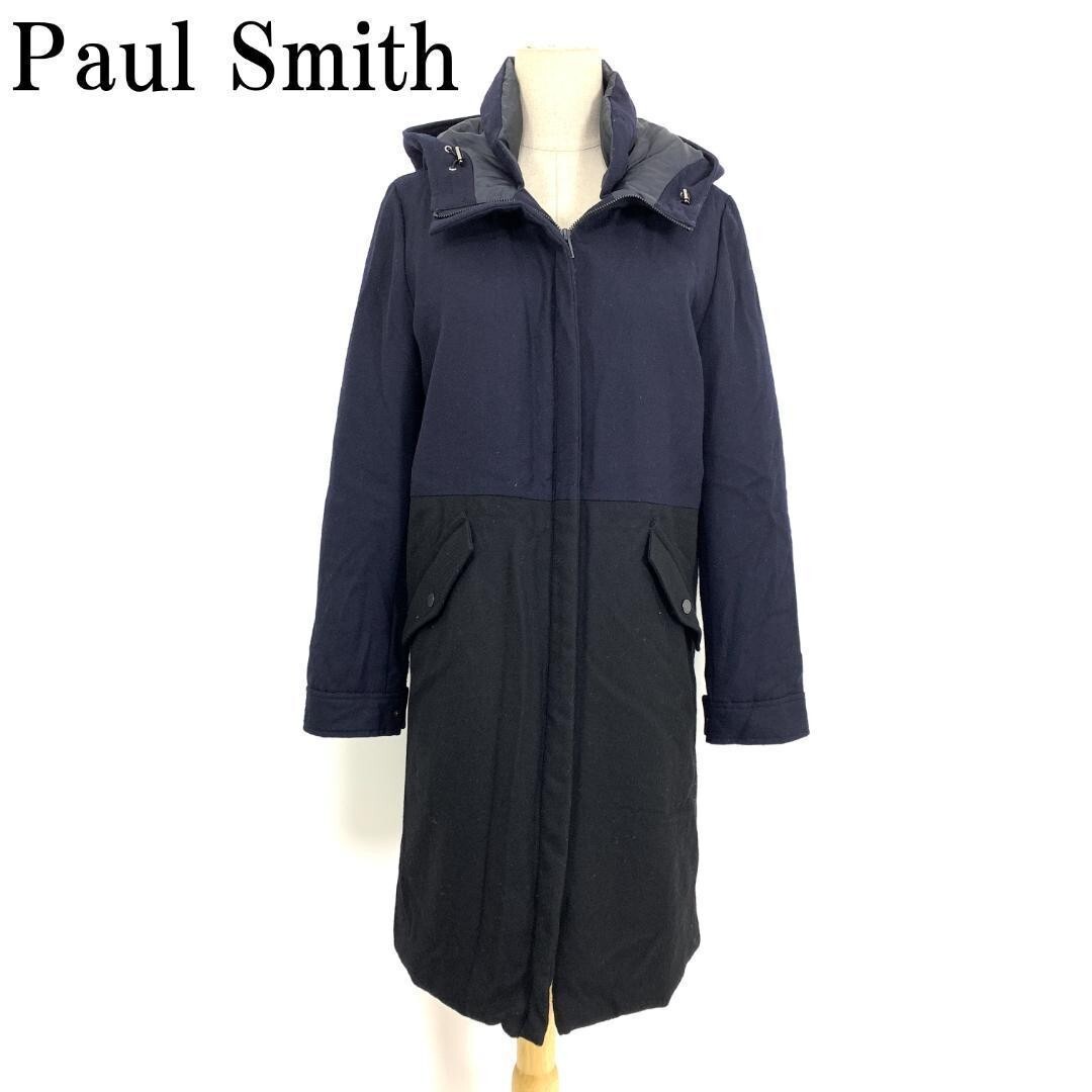 - LA7924 ポールスミス Paul Smith フード付き バイカラー ロング アウター ブラック ネイビー ダウンコート ウール フェザー 黒 紺 42