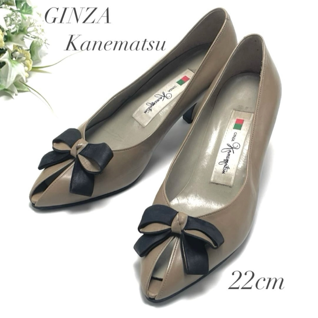 > GINZA Kanematsu 銀座かねまつ パンプス レザー ブラウン ブラック バイカラー リボン 22cm オープントゥ レディース アンティーク Y2K