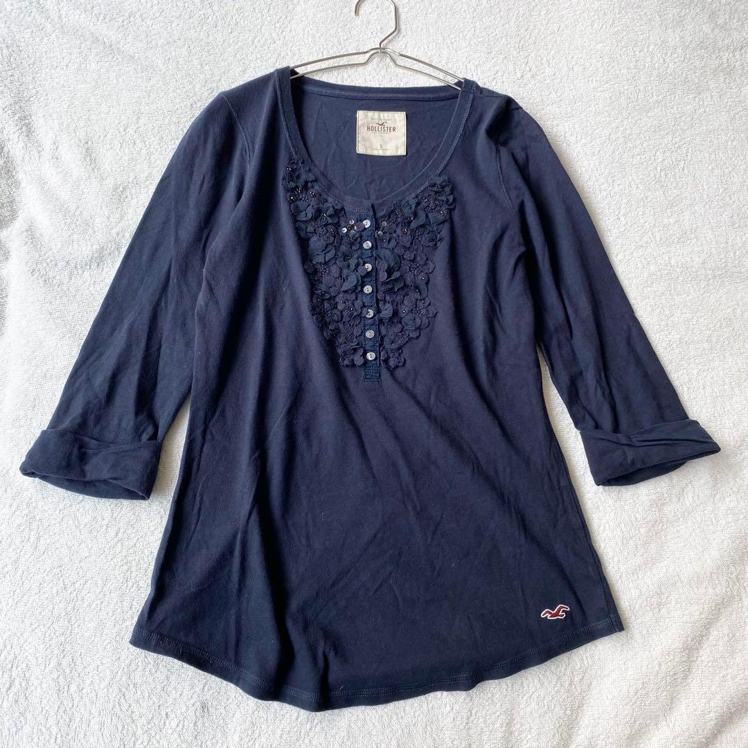 - 【ホリスター】HOLLISTER 7分袖カットソー Uネック ハーフボタン 花柄レース 袖折返 F 紺 ネイビー BBAR731