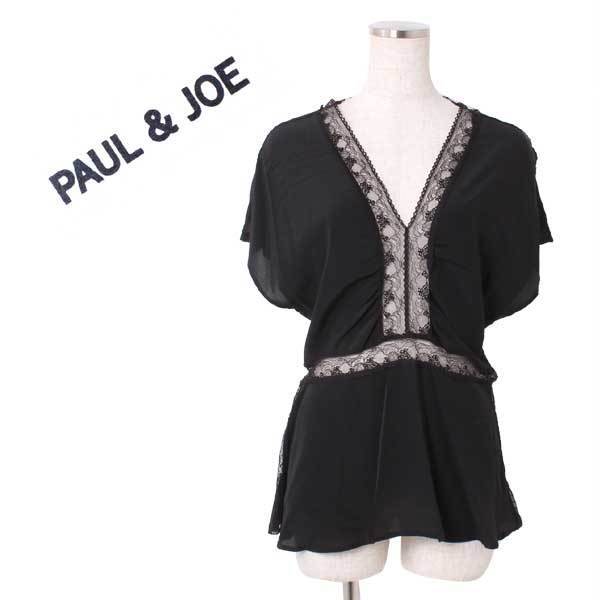 > 新品 PAUL & JOE 定価56,000円 FJILL TOP レース切替 シルク ブラウス size1 ブラック ポール&ジョー