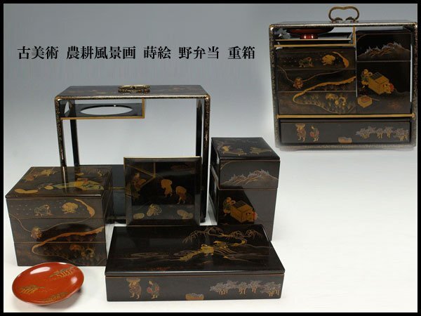 - 【金閣】古美術 農耕風景画 蒔絵 野弁当 重箱 旧家蔵出 送料無料(XA959)