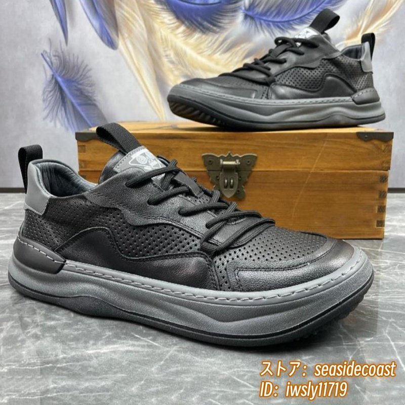 > 新品 スニーカー 本革 レザーシューズ メンズ 高級品 ウォーキングシューズ ローファー スリッポン トレンド 柔らか 牛革 通気性 黒 27.0cm