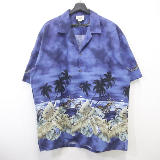 > R421 90sビンテージ PACIFICLEGEND 半袖アロハシャツ■1990年代製 表記2XLサイズ ブルー 開襟 オープンカラー コットン パームツリー 古着