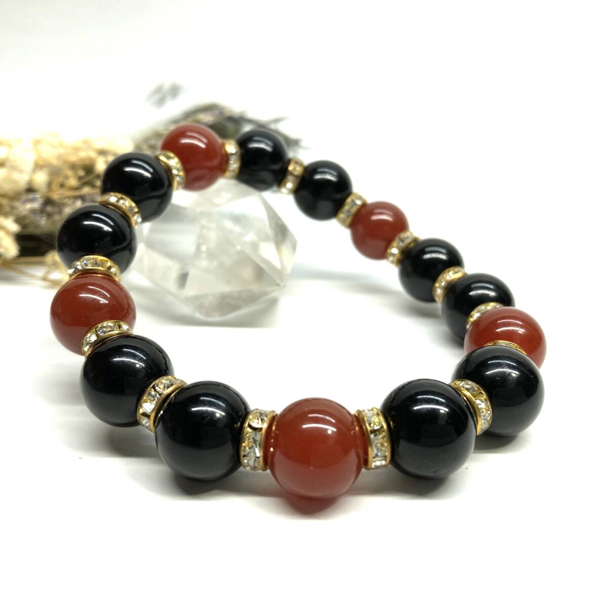 - モリオン&赤瑪瑙 パワーストーン ブレスレット 天然石ブレス (ゴールド) 12mm 幸運 開運 メンズ 男性