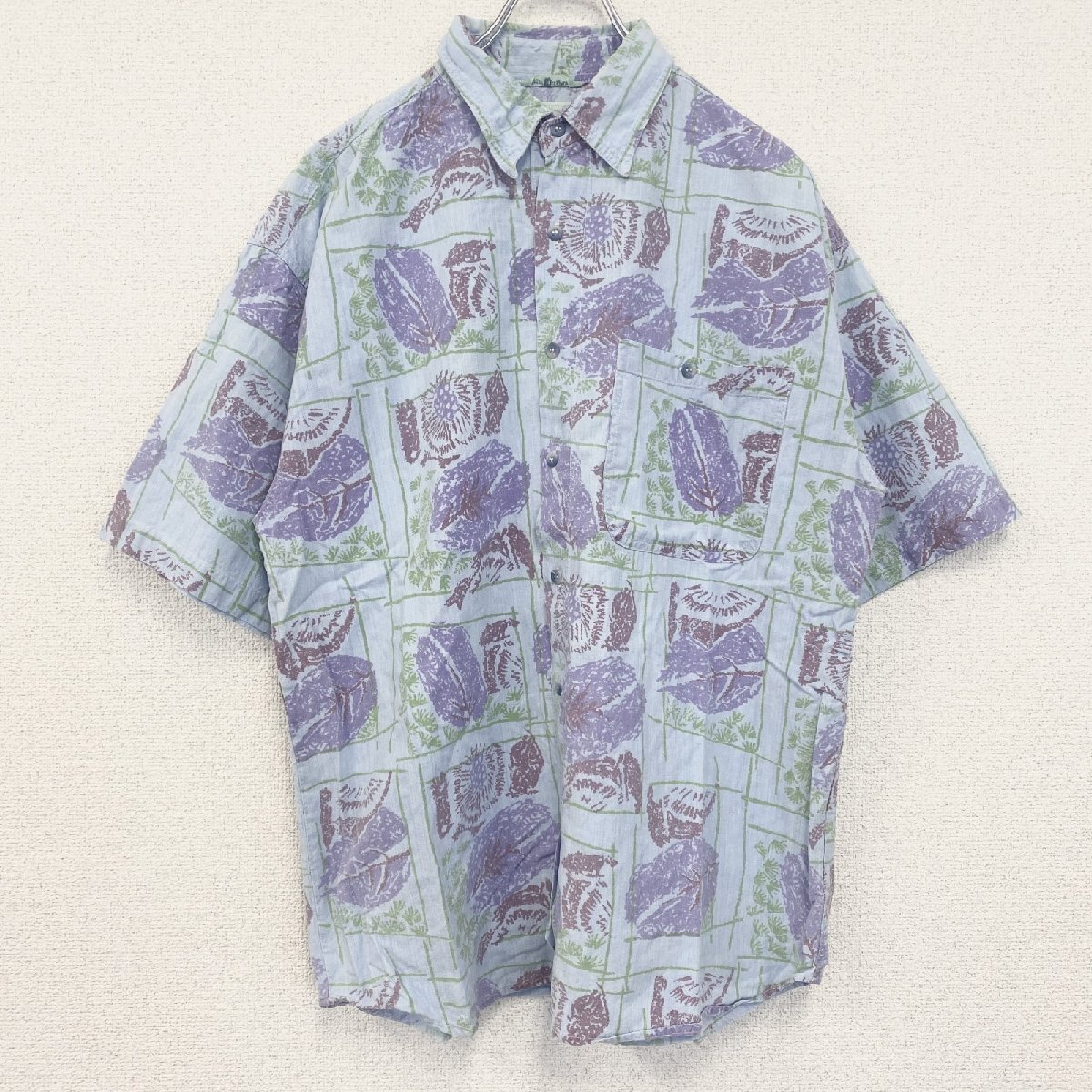 > 古着 used 半袖プリント総柄シャツ レトロデザイン アロハ 葉っぱ 草 リーフ 胸ポケット 植物 水色 ブルー Mサイズ