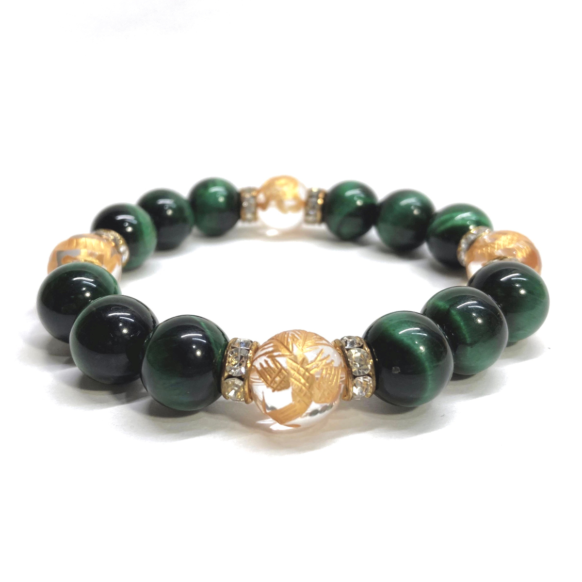 - 四神獣金彫水晶×グリーンタイガーアイ 12mm パワーストーン ブレスレット天然石 青龍 白虎 玄武 朱雀 運気上昇 お守り 四神獸 四神相応 G
