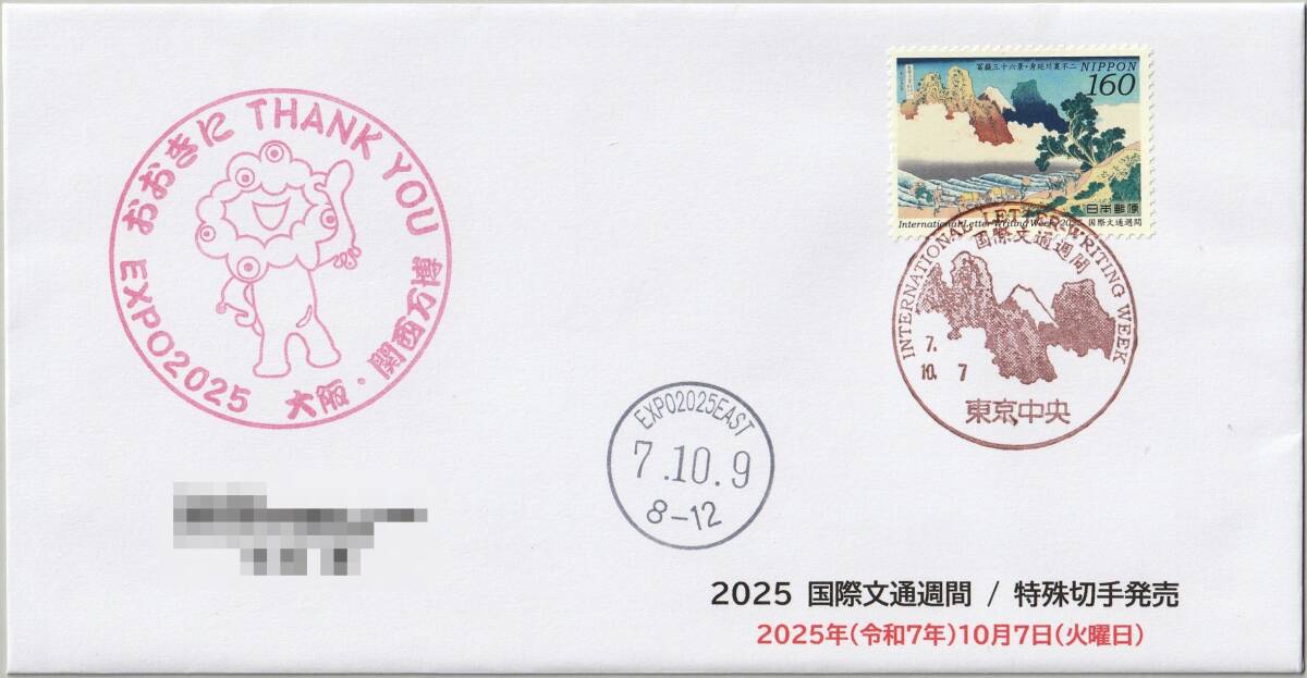 - 2025年 日本国際博覧会(2025大阪・関西万博)を記録するカバー(国際文通週間貼)/東京中央局差出/EXPO2025 EAST郵便局着印/令和7年10月7日