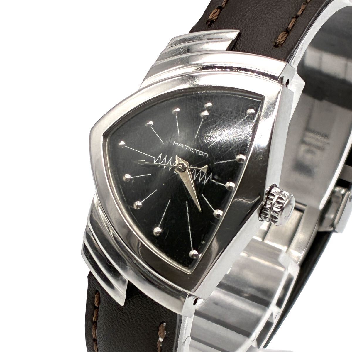 - 1円 美品 HAMILTON ハミルトン 腕時計 ベンチュラ クォーツ レザー ステンレス ユニセックス 黒文字盤 シルバー 稼動品 正規品