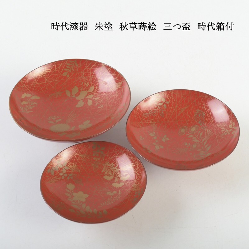 - 時代漆器 朱塗 秋草蒔絵 三つ盃 時代箱付 NGKT