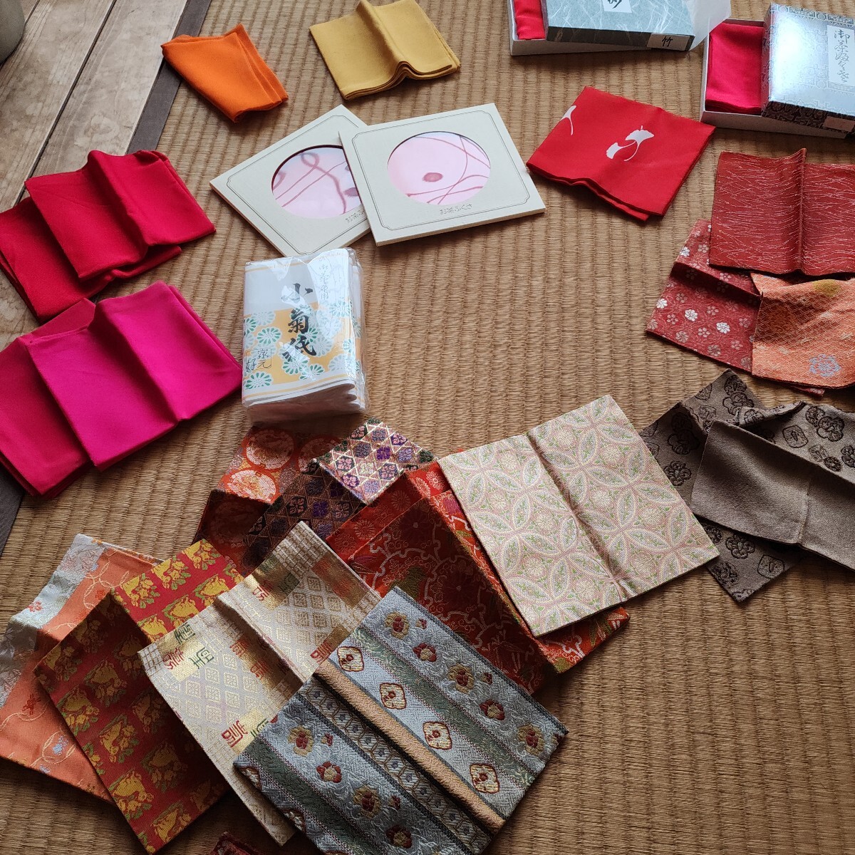- 茶道一部新品ほぼ中古痛み、折れ癖ありあり茶道具お茶ふくさ畳縁封16枚、無地8枚、箱入4枚、銀杏1枚、小菊懐紙5束入セット稽古用 和装小物