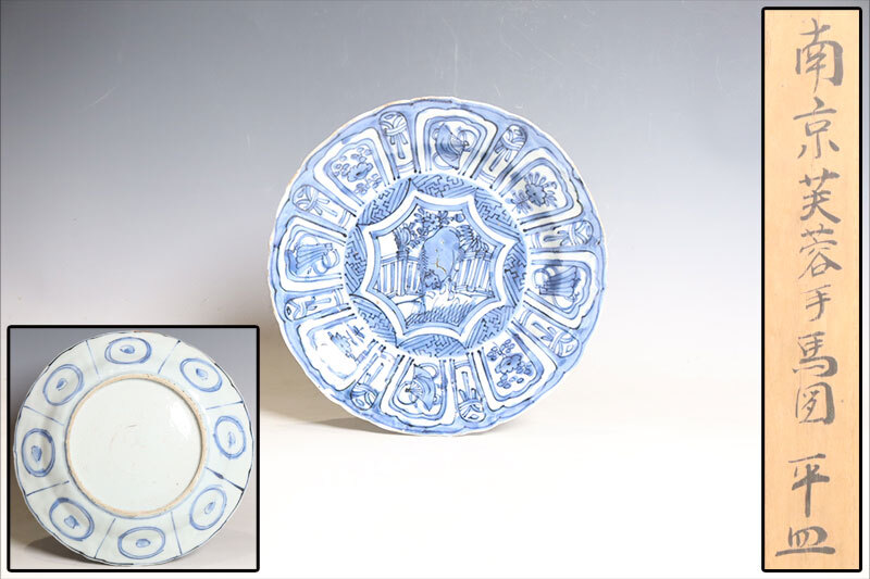 - 中国美術 青花馬紋盤 唐物芙蓉手皿 木箱附 (T154)
