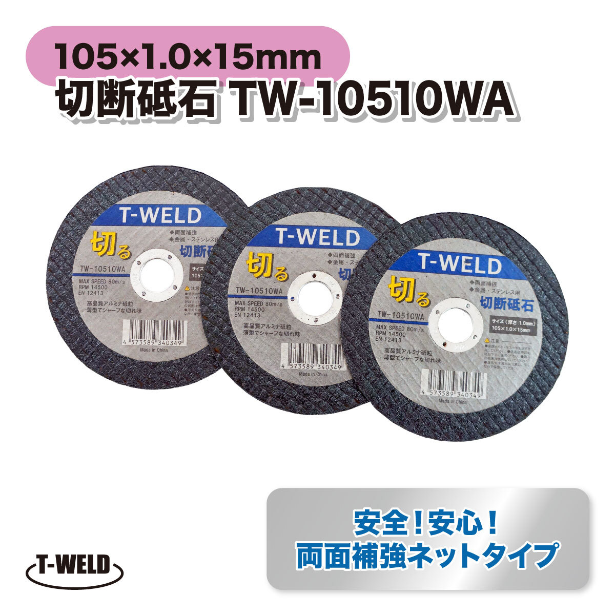 > 鉄 ステンレス用 切断砥石 サンダー 両面補強ネットタイプ TOAN型番: TW-10510WA 厚み1.0mm 寸法:105×1.0×15mm 10枚