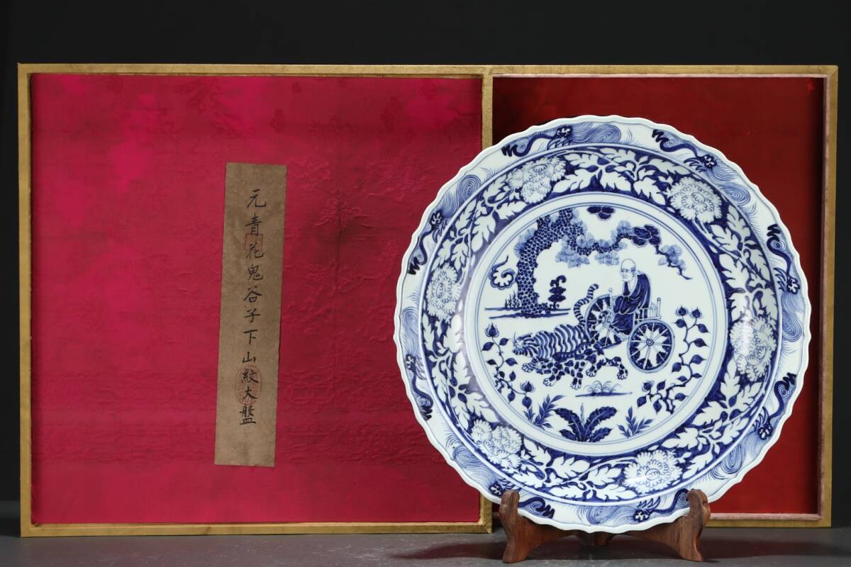 > 元時代 青花 染付 鬼谷子下山文大盤 唐物 箱付き 陶磁器 中国美術 古美術 置物 骨董品 高さ7.5cm 胴径45cm RG130
