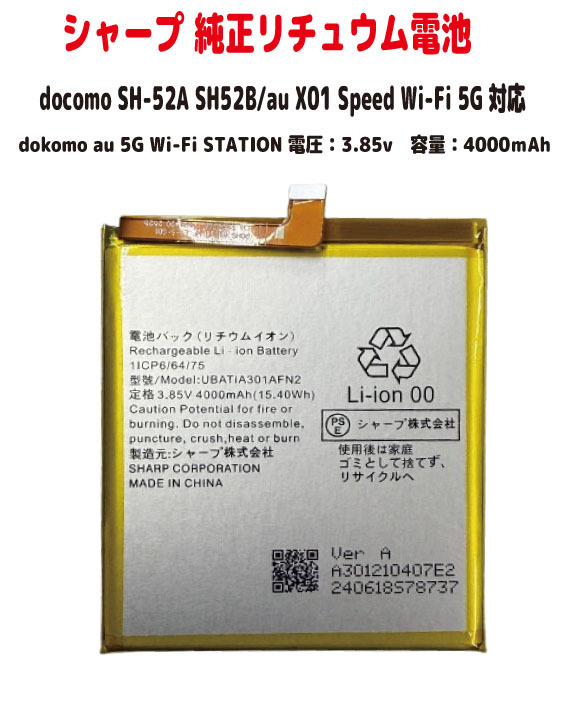 > シャープ純正品 ドコモ SH-52A SH-52B au X01peed Wi-Fi 5G Dokomo 5G wi-Fi STAION リチュウム電池 容量4000mAh 電圧3.85V PSE適合