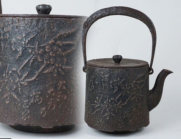 - D-337■古い鉄瓶 筒型漢詩和歌文桜 大和心の桜 湯沸茶道具
