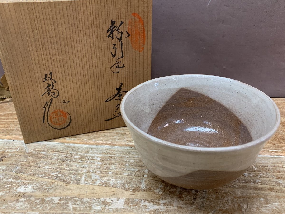 > 【YB-2694】未使用 水野双鶴 作 粉引手茶碗 直径約12.5cm 陶器 茶道具 共箱 東京引取可【千円市場】