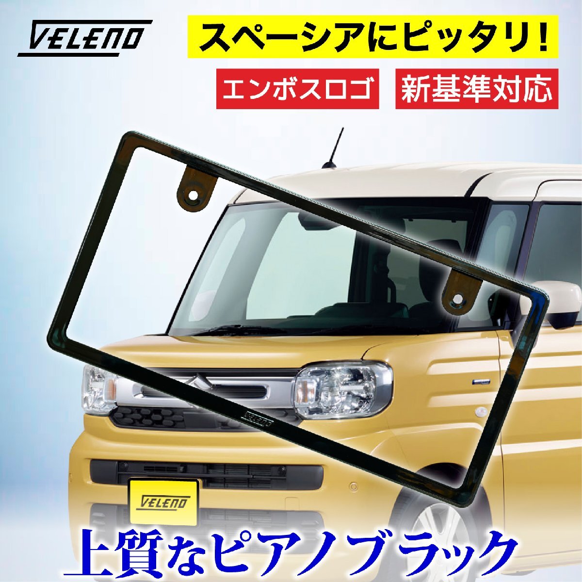 > 新基準対応 スペーシア 専用 ナンバーフレーム VELENO ピアノブラック エンボス ドレスアップ フロント リア 普通車 軽自動車 1枚 e315