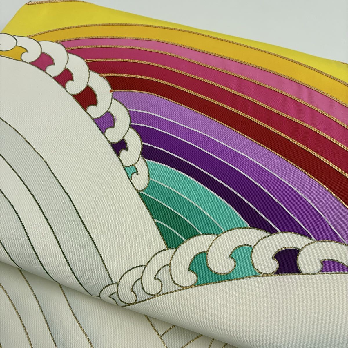 - 名古屋帯 正絹 塩瀬 荒波 金駒刺繍 カラフルな染め 九寸 F-269