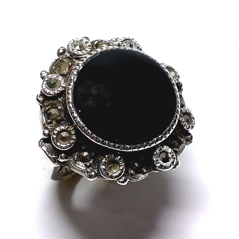 - 【侍】SILVER925 シルバー オニキス 天然石 マーカサイト装飾 9号 指輪 リング アクセサリー 保存袋付き 20=903