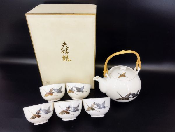 - サ/ 庫山窯 銀彩 夫婦鶴 茶器揃 急須 湯呑5客 ツル 前畑陶器 箱付き /HY-1235