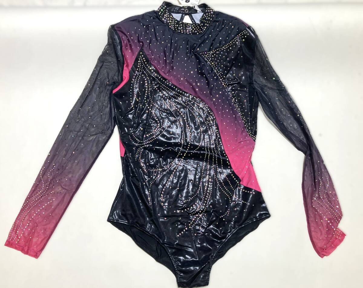 - 特大2XLサイズ 黒PINK/IEFIEL社製 長袖フィギュアスケートレオタードクリスタルラインストーンボディスーツバレエ体操ダンス ウエア