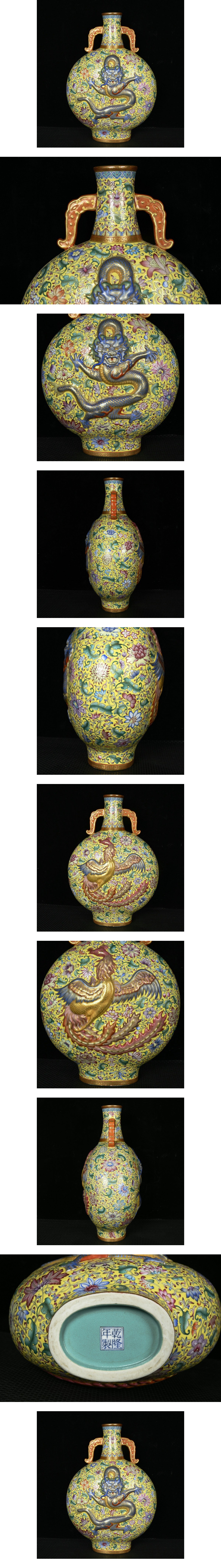 - 中国古美術 大清乾隆年製款 琺瑯彩 描金 古陶磁 黄地 高浮雕 纏枝蓮花 龍鳳抱月瓶 細密細工造 擺件 骨董品 古賞物 時代物 T16