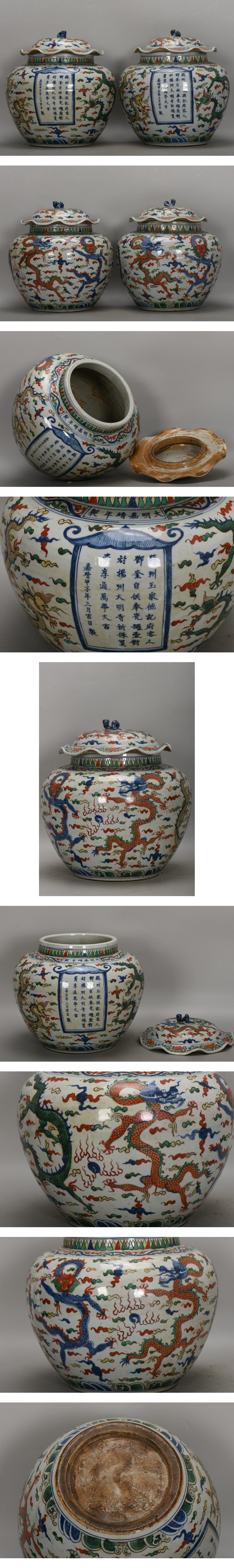 - ◆珍蔵◆中国古美術 大明嘉靖年製款 五彩 古陶磁 銘文 龍紋荷叶盖罐―對 細密細工造 擺件 骨董品 古賞物 時代物 A3