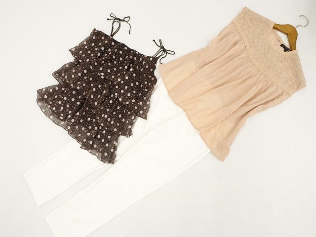 > 美品 AVIRA PINK等 ティアードキャミ+ノースリーブブラウス+スキニーパンツ コーデ3点セット M相当 茶地 水玉/ピンク/白 ガーリー系 20代~