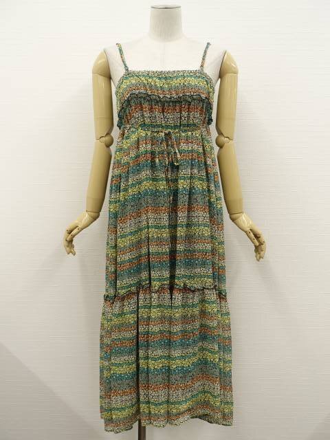 > 美品 エージーバイアクアガール AG by aquagirl ロング丈 シフォンキャミソールワンピース M 黒地 黄×オレンジ×緑×グレー 花柄