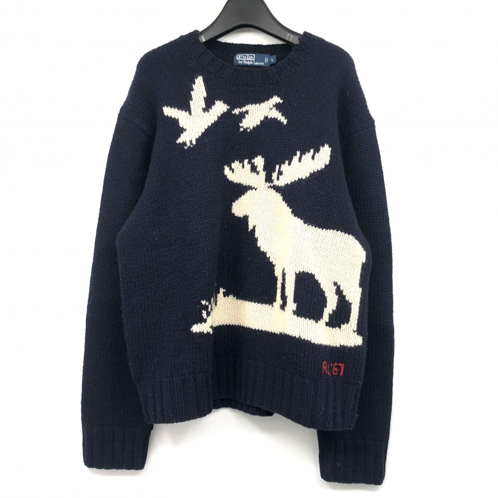 > 【中古】90s RALPH LAUREN HAND KINT RL67刺繍 ニット サイズL ネイビー ラルフローレン[240017651219]
