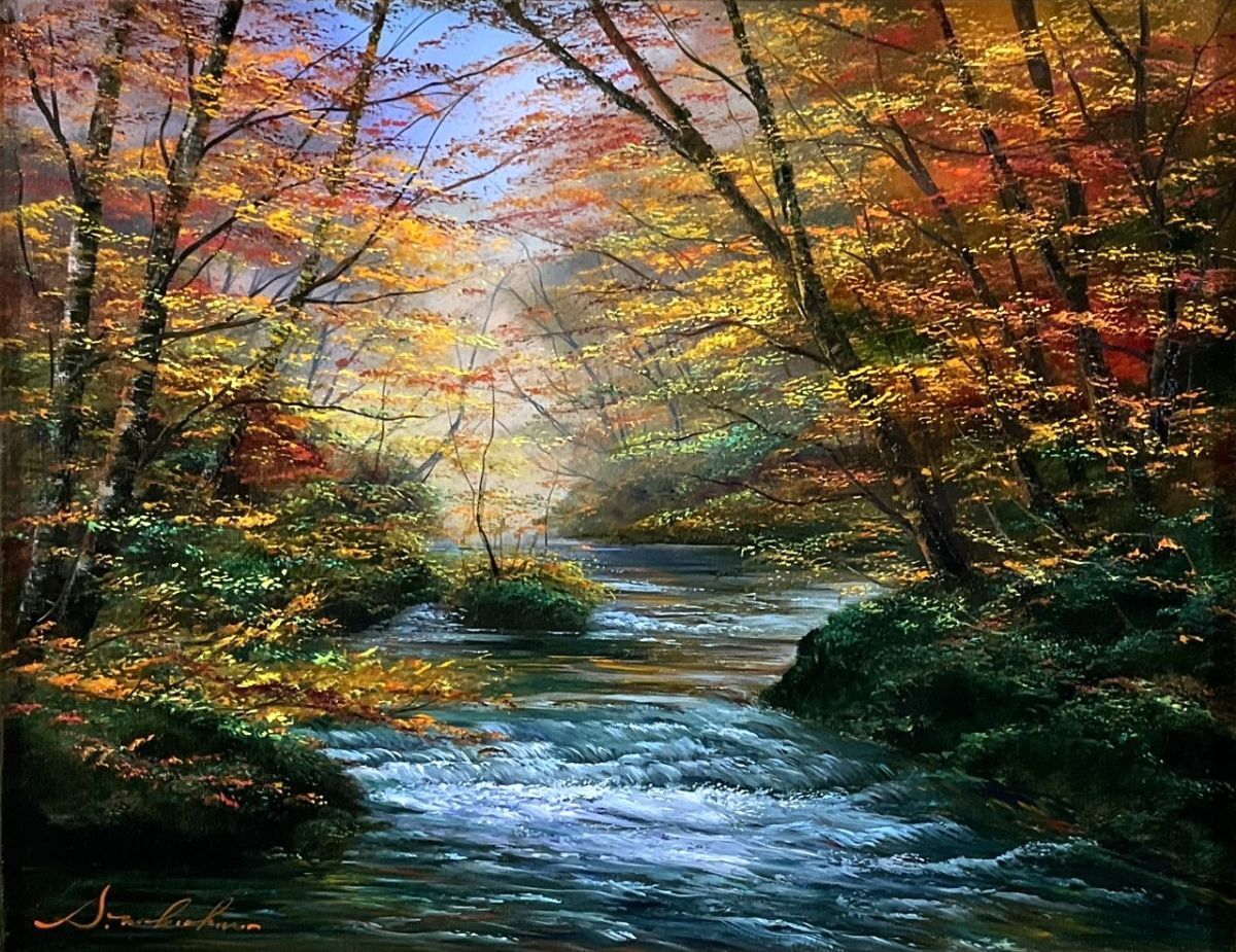 真作■油彩■中原真一■『奥入瀬』■リアリズム傑作■無所属 伊勢丹個展 市文化団体連盟理事■額付絵画■1e の出品となります。