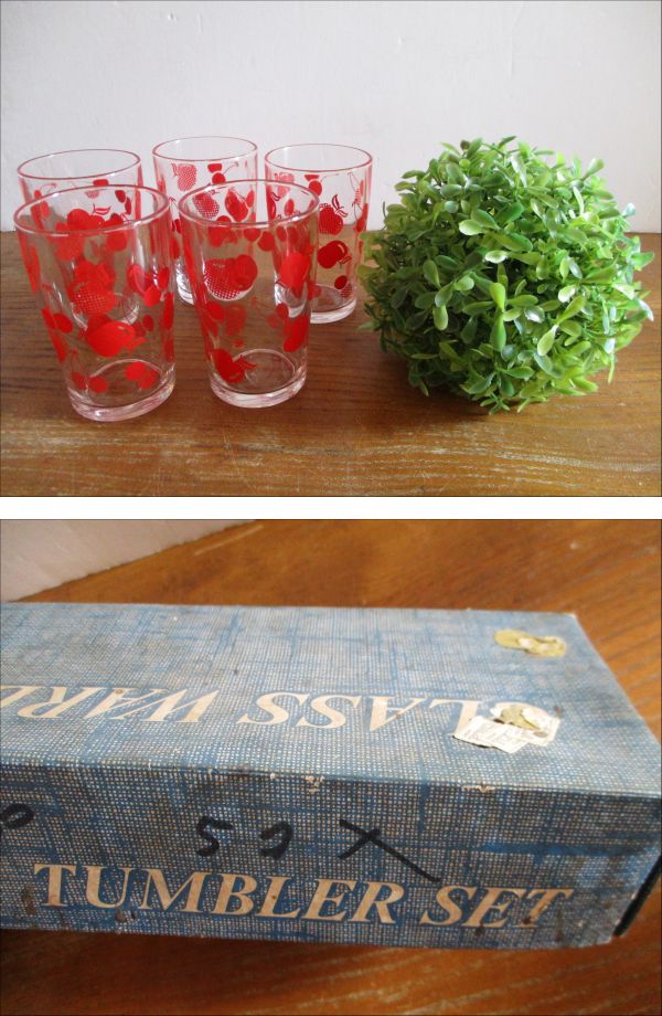 > 【昭和レトロ・未使用・箱入】りんご さくらんぼ フルーツ 果物 グラス 5個セット 小ぶりサイズ タンブラー デカンタ リンゴ サクランボ