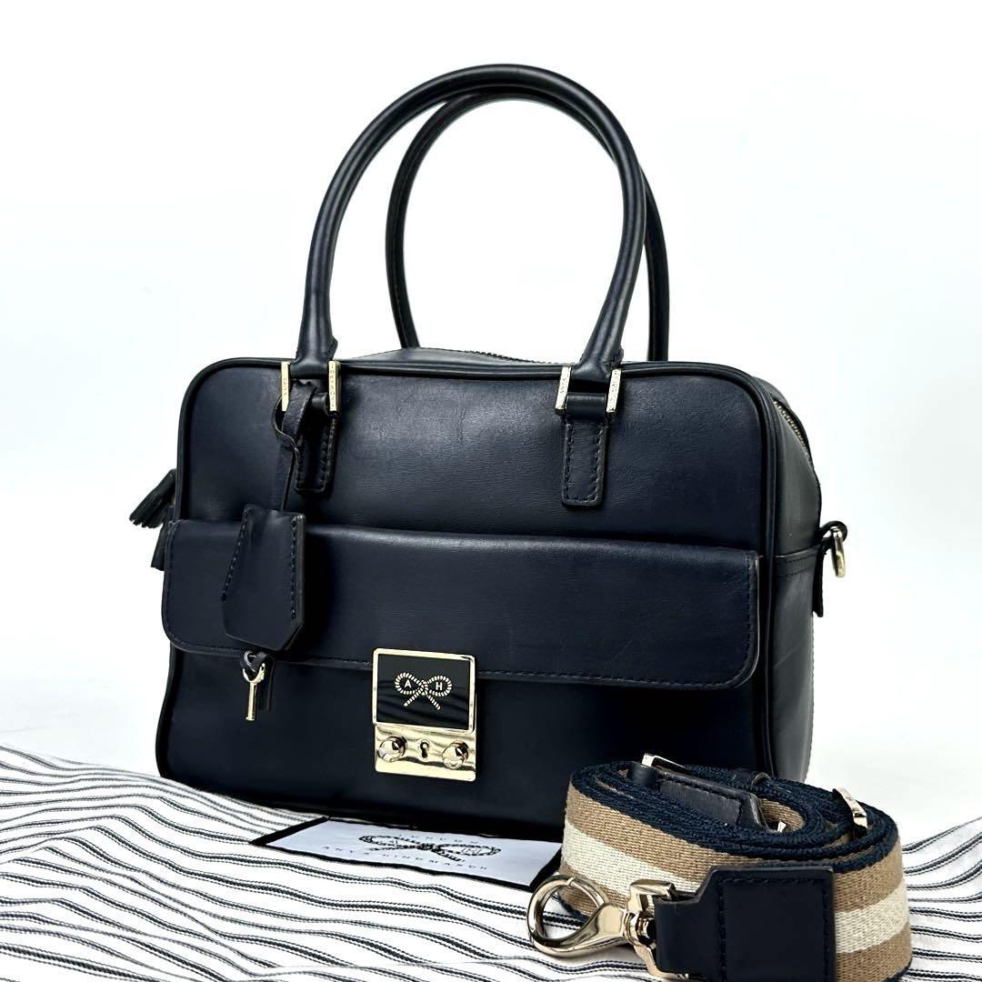 - 美品●ANYA HINDMARCH アニヤハインドマーチ カーカー ハンドバッグ 2way ショルダーバッグ 斜め掛け レザー 濃紺 ダークネイビー 黒系