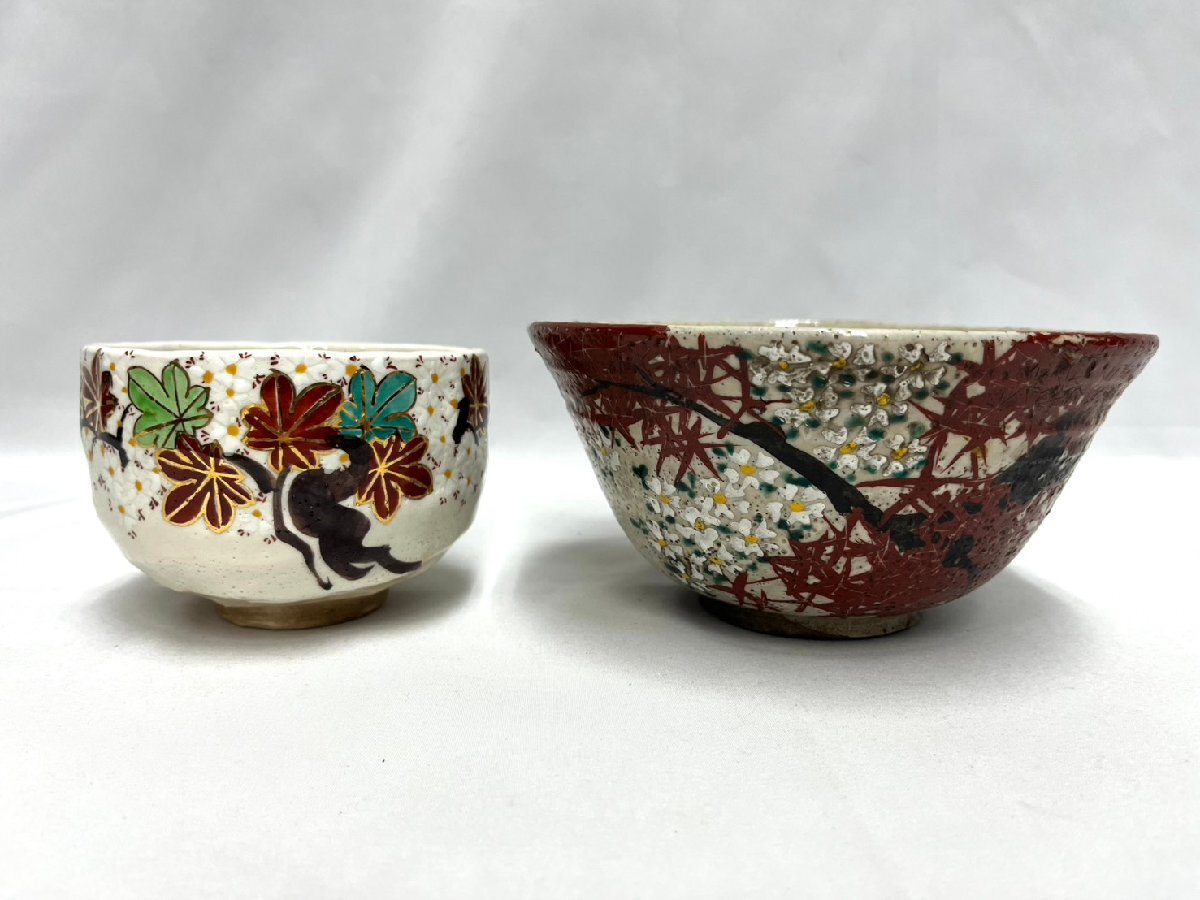 - AZ⑨♪和食器 おまとめ 2点 犬山焼 在銘 一久 君子? 紅葉 植物 花柄 直径:11㎝/17.4㎝ 高さ:8㎝/8.8㎝ 椀 陶器 陶磁器 和食器 骨董品♪