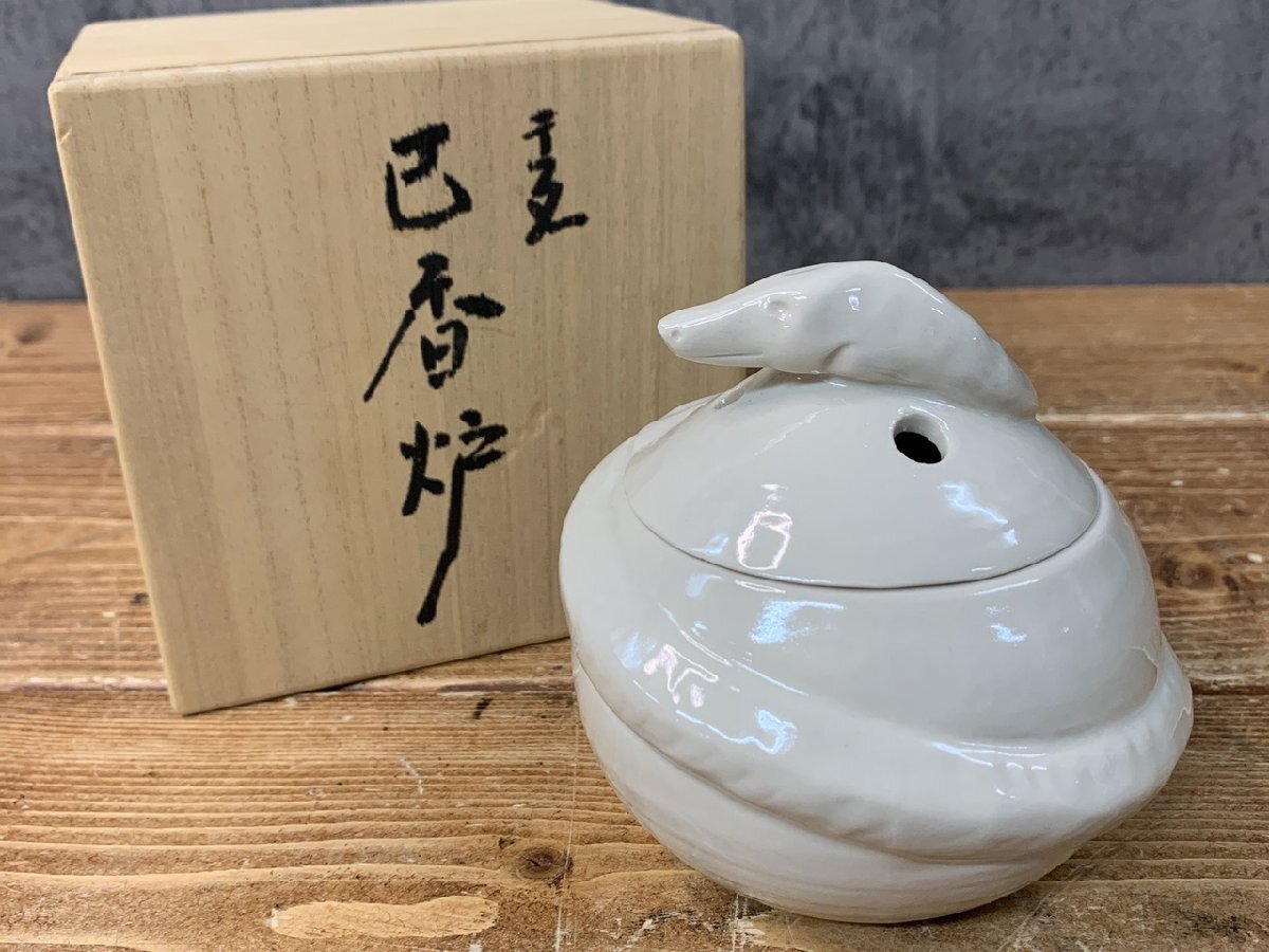 - 【T5-5015】未使用 加藤渓山 作 干支 蛇 ヘビ 白磁香炉 共箱 香道具 共箱付 現状品 同梱可【千円市場】