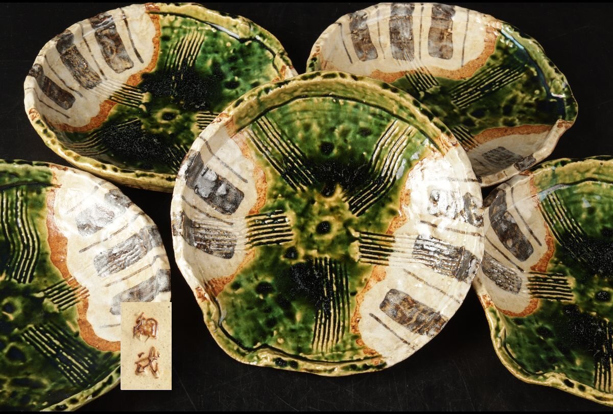 > [URA]在銘/織部釉片口深皿5客/10-10-150 (検索)骨董/皿/和皿食器/向付/小皿/中皿/割烹/細武